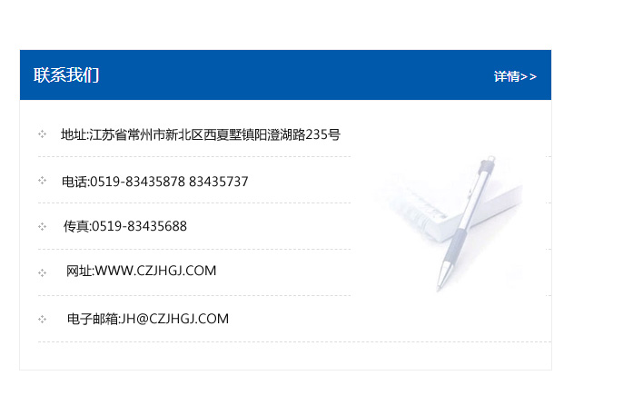 地址:常州市新北區友邦商務大廈1幢16、17層  電話:0519-85101652  傳真:0519-85112595  郵編:213022  網址:www_cz-jiayue_cn.nazhimei.com  郵箱:xiajifengaa@163.com